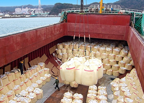 - 袋詰めされた貨物の荷役を行います。荷揚げされた貨物はフォークリフトですぐに倉庫に運ばれます。岸壁のすぐ後背地に倉庫があり、雨濡れ厳禁な貨物でも心配いりません。
