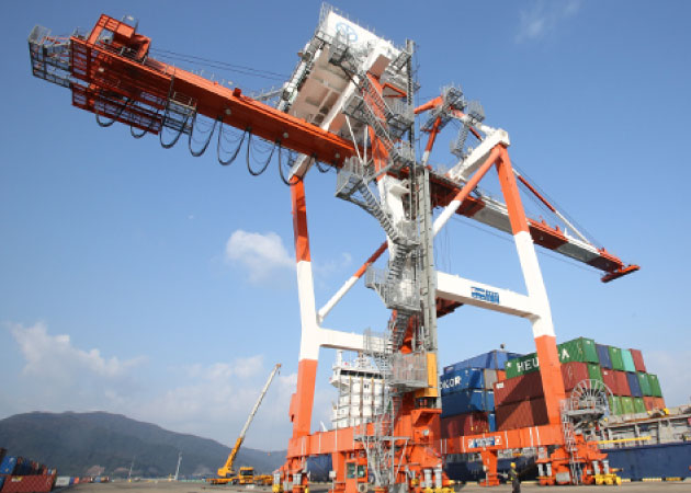 当社ではガントリークレーンを用いて船舶からコンテナを吊り上げ、岸壁側でコンテナヤード内を走行している専用のシャーシにコンテナを積む荷役作業を行っております。敦賀港では韓国との定期コンテナ船としてHEUNG-A LINE CO.,LTD./SINOKOR MERCHANT MARINE CO.,LTD.(株式会社シノコー成本)、KOREA MARINE TRANSPORT CO.,LTD.(高麗海運ジャパン株式会社)が寄港しております。