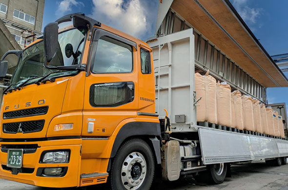 工場で生産された原料を専用のバルク車に積載し、お客様指定のサイロまで輸送し納入します。